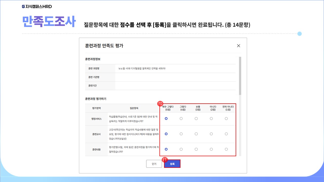 ④ 질문항목 점수선택 후 [등록]하여 제출합니다.